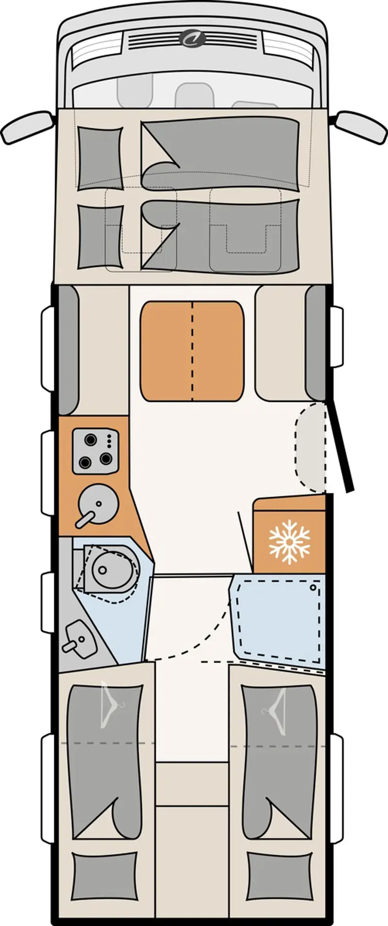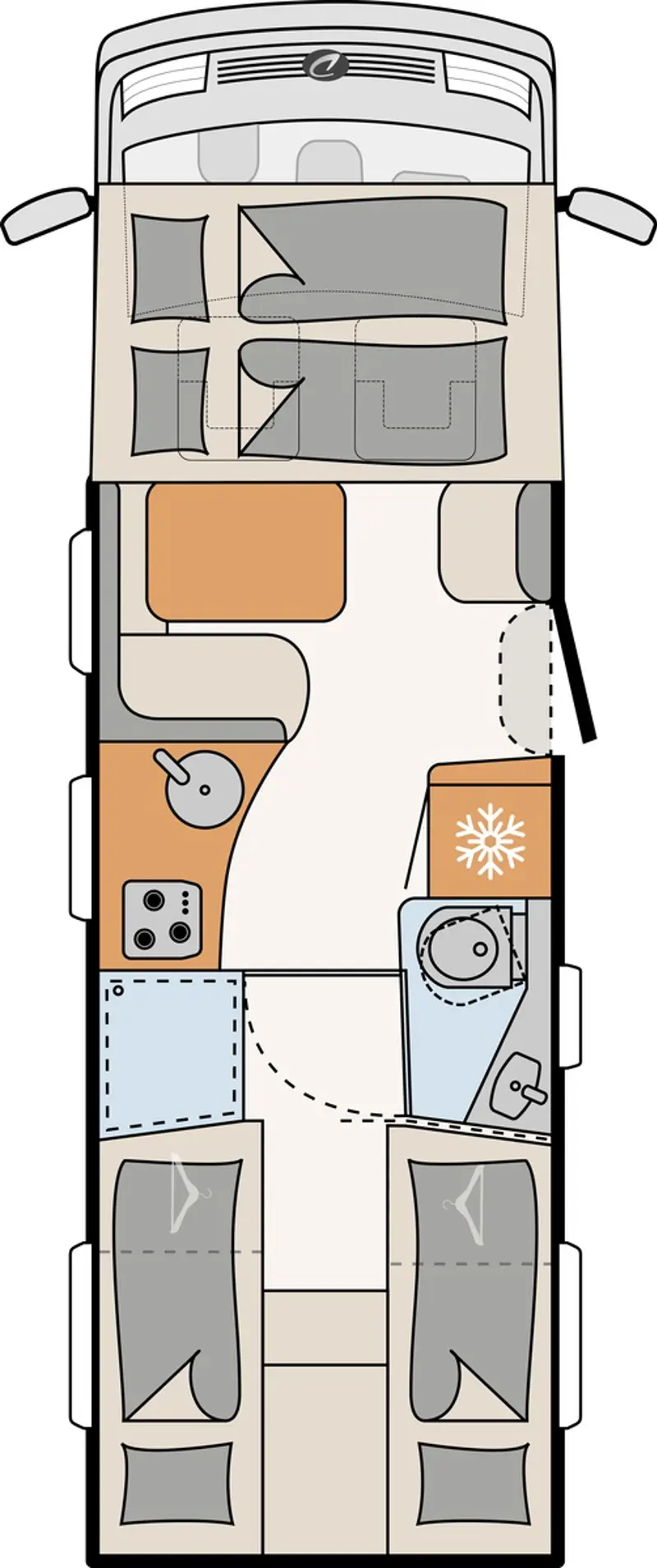 - LifeTime-Plus bodywork construction with wood-free, GRP-clad underfloor, side walls with PU strips and XPS insulation